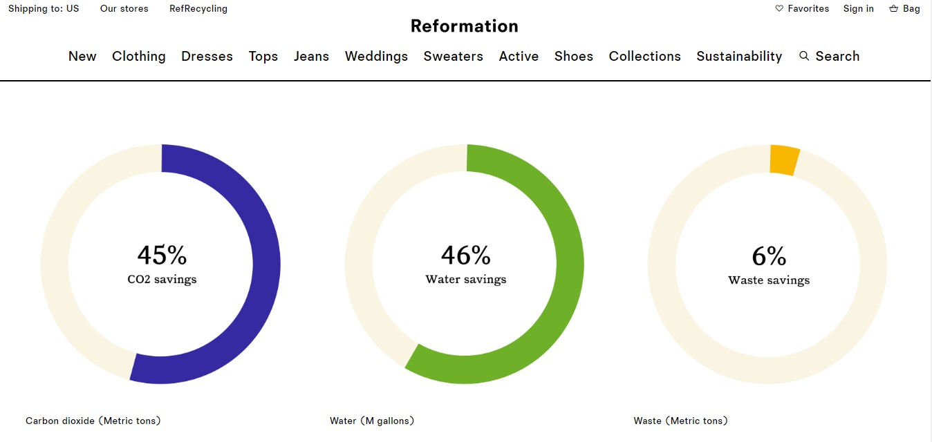 It can be used to showcase things like how many of your materials are made from recycled goods, how much of your energy comes from renewable resources or how much waste you’ve diverted from landfills. Here’s an example of a goal meter on sustainable clothing brand Reformation’s website.