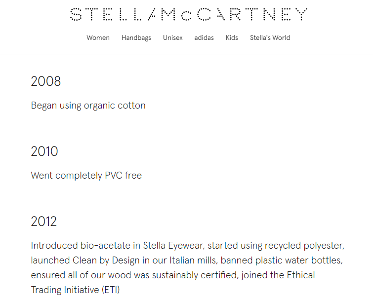 A timeline can be a simple and easy way to show how your business has progressed toward sustainable practices over time. Take a look a Stella McCartney's timeline for her luxury fashion brand. She lays out when they made the switch to 100% organic cotton, stopped using angora, or reached 100% power of their stores and facilities through renewable energy.