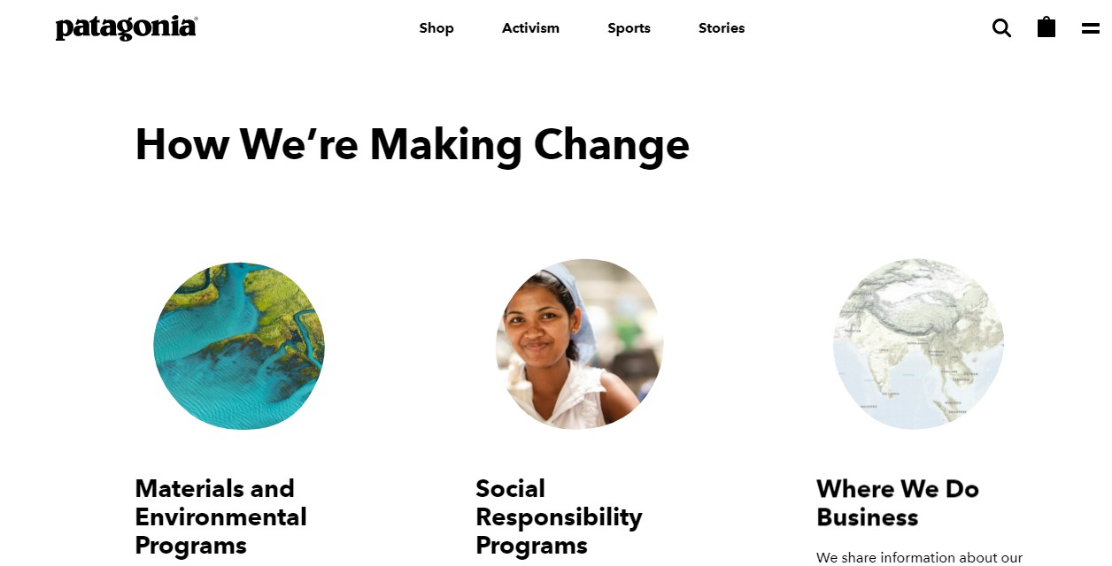 Breaking your sustainability efforts into a few (usually 3-5) pillars is one of the easiest ways you can inform your consumers of your actions, especially for businesses that are engaged in a few different avenues of sustainability. You could add this to your general ‘About’ page, a Mission page if you have one, or create an entirely new page centered around how your team is making a difference. You might even include it on your homepage if sustainability is a core attribute and differentiating factor of your business.
