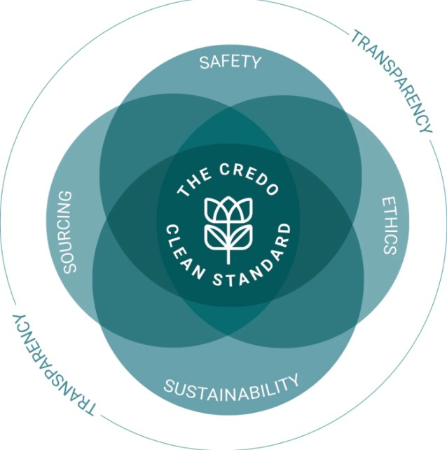 Similar to goal meters but without any specific measurements, a simple graphic element is a creative way to showcase what your business is focused on with regard to sustainability. Here is a matrix created by clean beauty organization Credo Beauty to showcase what makes up their Credo Clean Standard. Their use of interlocking circles references the belief that all of these elements affect one another and their overall organization.