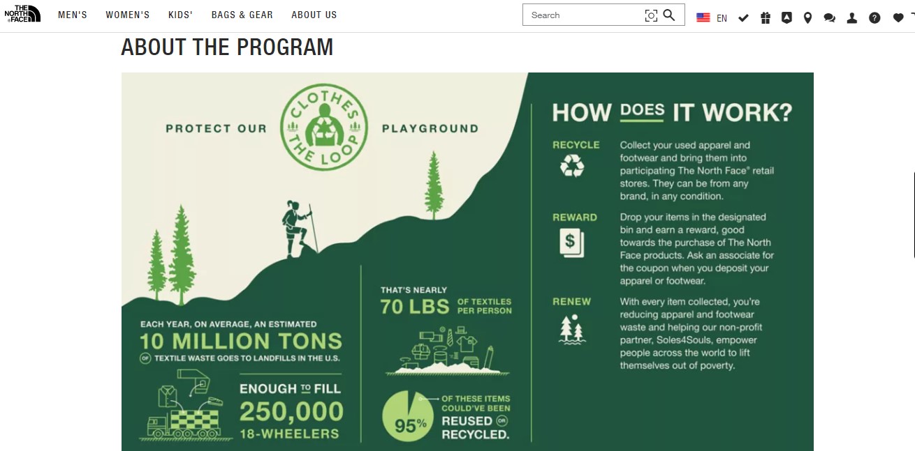 This could also include an infographic that lays out how a sustainable program you offer works. Here’s an example of North Face’s Clothes the Loop program.